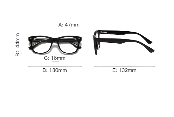 Size: Lens width 47 mm · Frame height 44 mm · Bridge 16 mm · Total width 130 mm · Temple length 132 mm